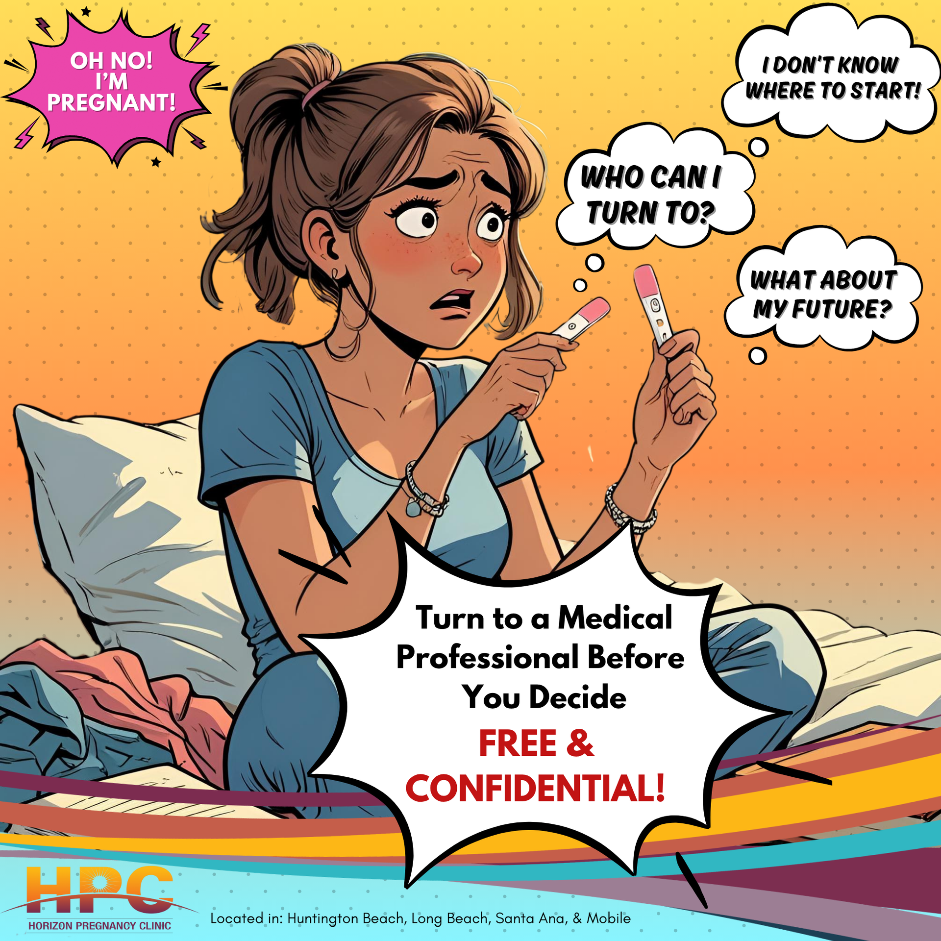 We provide free and confidential unexpected pregnancy services in Southern California, including Huntington Beach, Long Beach, Santa Ana, and surrounding areas on our mobile clinic. Our services include pregnancy testing, ultrasounds, abortion information, and after-abortion support. Confirm your pregnancy and learn about your options today.